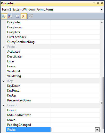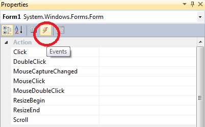 9. Select the form in the designer then go to the Properties Window and find the Events button