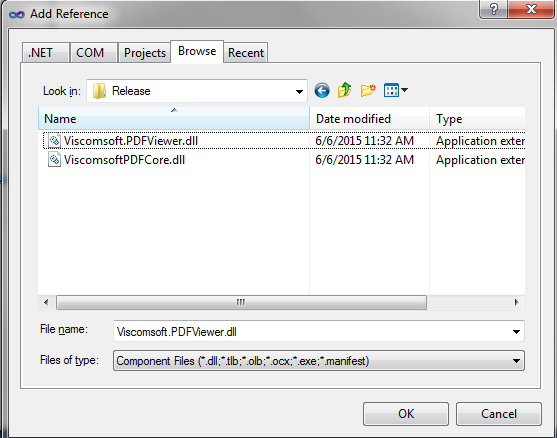 3. Select Browse tab, Navigate to the extracted .NET PDF Viewer Pro SDK for REDIST folder, open it, and then double-click Viscomsoft.PDFViewer.dll