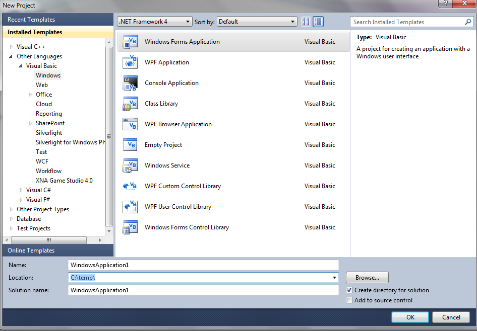 1. Launch Visual Studio 2010 or another version of Visual Studio. Select Visual Basic, Select Windows Form Application.