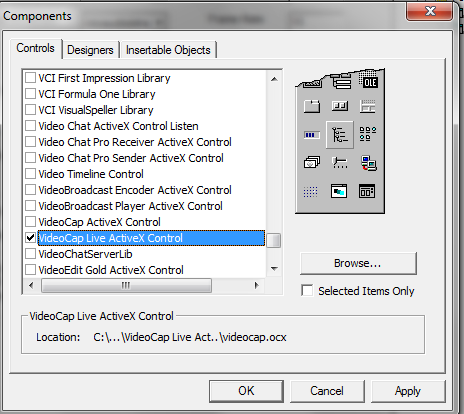 Assuming that you have already run the Videocap Live ActiveX Control installation program and started Visual Basic, the next step is to create a project. To do this begin by selecting the "New Project" command from the file menu and select "Standard EXE" as your project type. Then use the "Project/Components.." command to include the file "videocap.ocx" into the new project. You will see VideoCap Live ActiveX Control icon appear at the bottom of the toolbox.